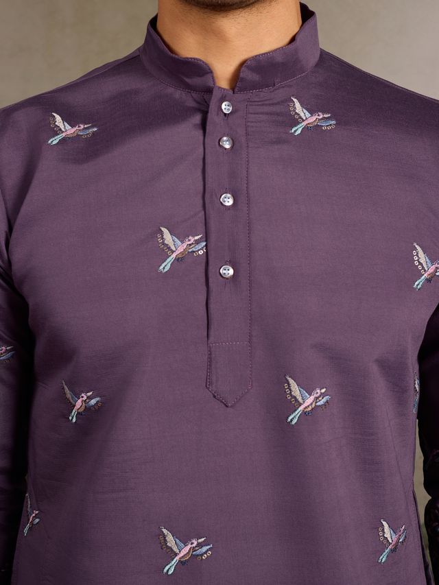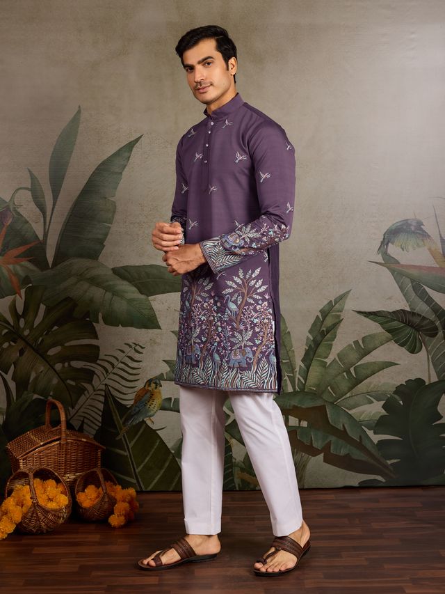 Dusty purple White Viscose Silk with Thread & Sequin Embroidery - Designer Men's Kurta