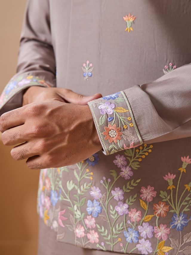 Grey Multi Thread with Sequence Embroidered Work VISCOSE SILK - Designer Men's Kurta