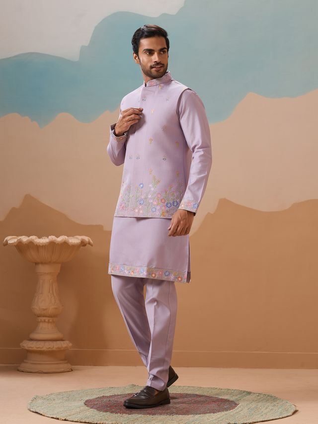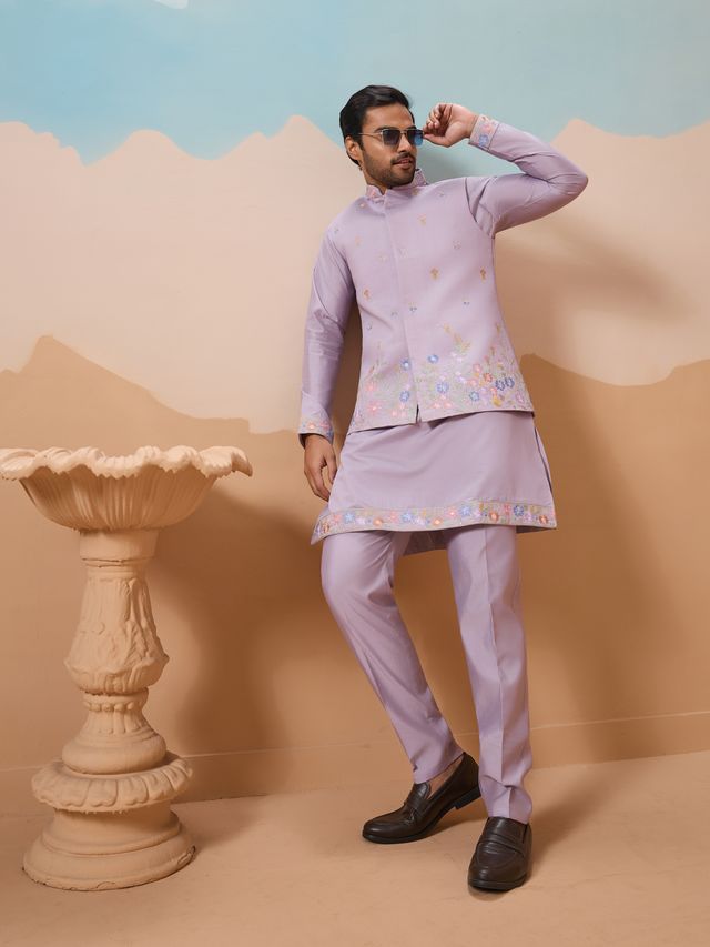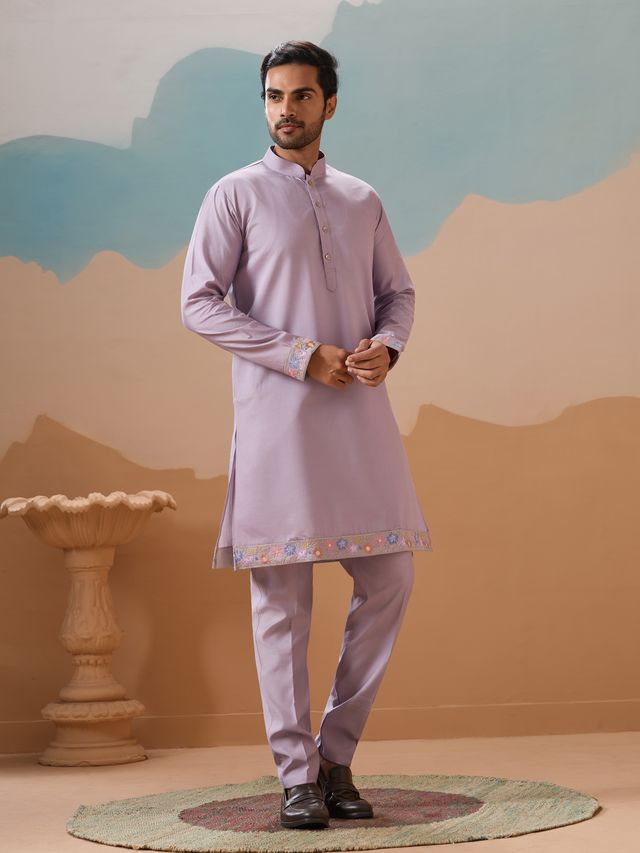 Lavender Multi Thread with Sequence Embroidered Work VISCOSE SILK - Designer Men's Kurta