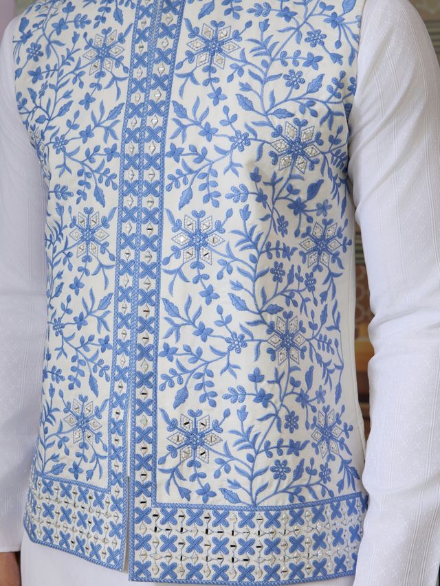 White Kurta & Bottom with Blue Jacket | Silk Real Mirror Work with Thread & Sequin Embroidery | Festive & Wedding Wear - Designer Men's Kurta Set with Koti Jacket