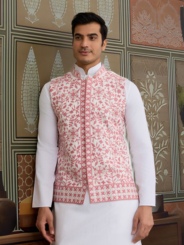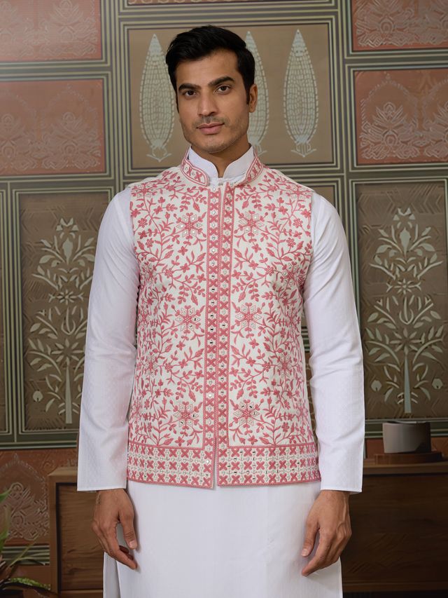 White Kurta & Bottom with Pink Jacket | Silk Real Mirror Work with Thread & Sequin Embroidery | Festive & Wedding Wear - Designer Men's Kurta Set with Koti Jacket