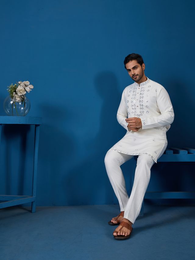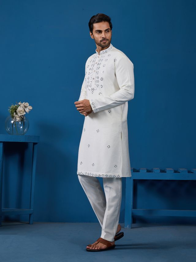 WHITE REAL MIRROR WORK WITH THREADS VISCOSE SLIK- DESIGNER MENS KURTA